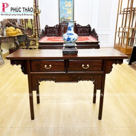 Bàn bày đồ gỗ gụ có phần mặt phẳng rộng rãi, chân bàn thon gọn nhưng chắc chắn, tạo nên dáng vẻ nhẹ nhàng mà vẫn bền vững. Hai ngăn kéo nhỏ xinh không chỉ mang tính trang trí mà còn tăng thêm công năng, giúp lưu giữ những vật dụng cần thiết.
