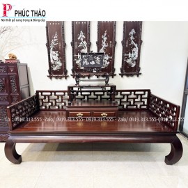 Ba mặt của giường được quây vách gỗ chắc chắn, tạo thành dạng giường La Hán đặc trưng. Các vách quây được thiết kế cân đối, vừa tạo điểm tựa khi ngồi vừa giúp tăng tính thẩm mỹ cho tổng thể. Phần vách nổi bật với họa tiết chạm triện liên hoàn, tạo nên sự thông thoáng nhưng vẫn đảm bảo tính kín đáo. Những ô triện được sắp xếp đều đặn, mang lại cảm giác hài hòa và cân đối cho toàn bộ chiếc giường.